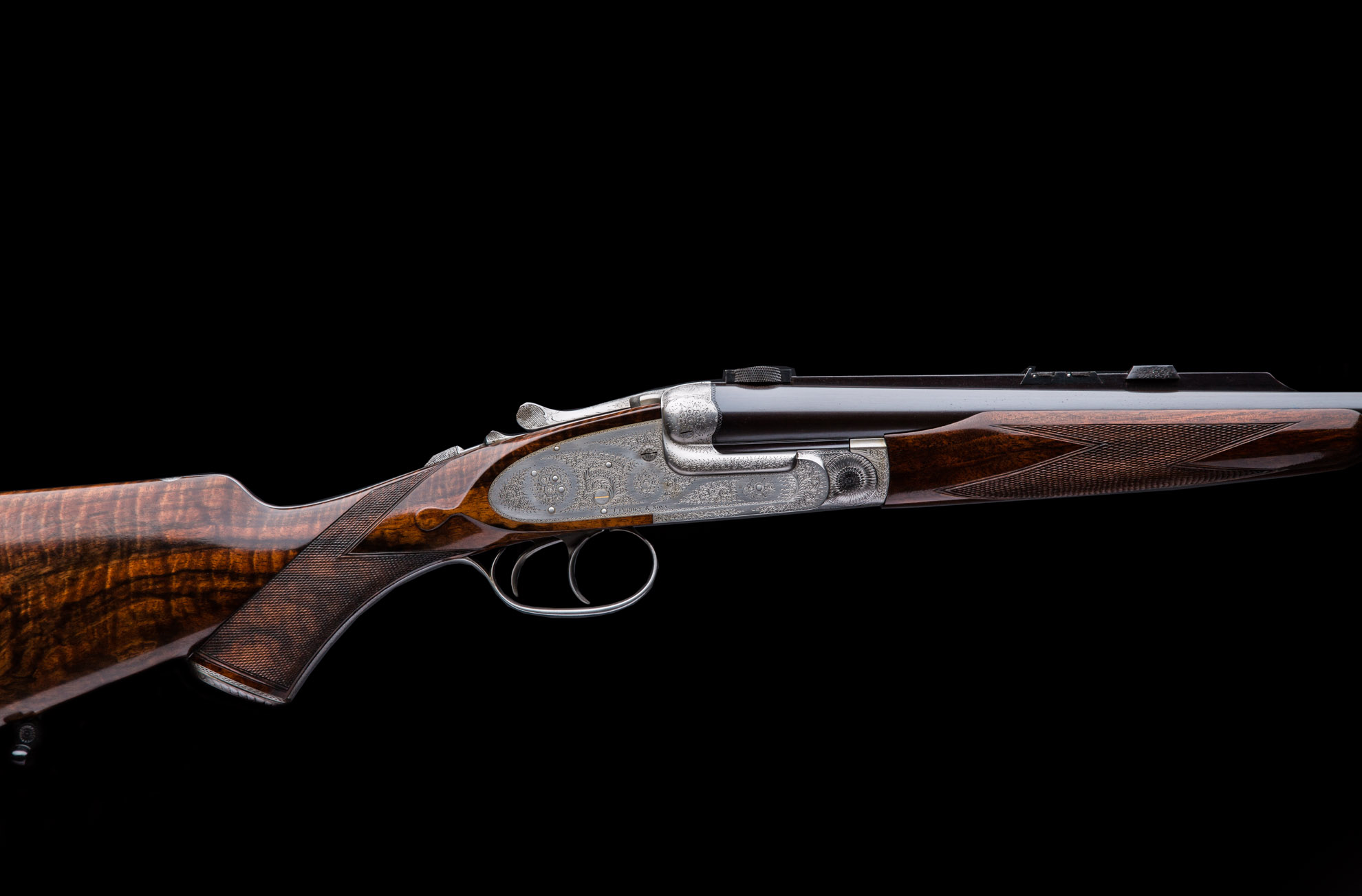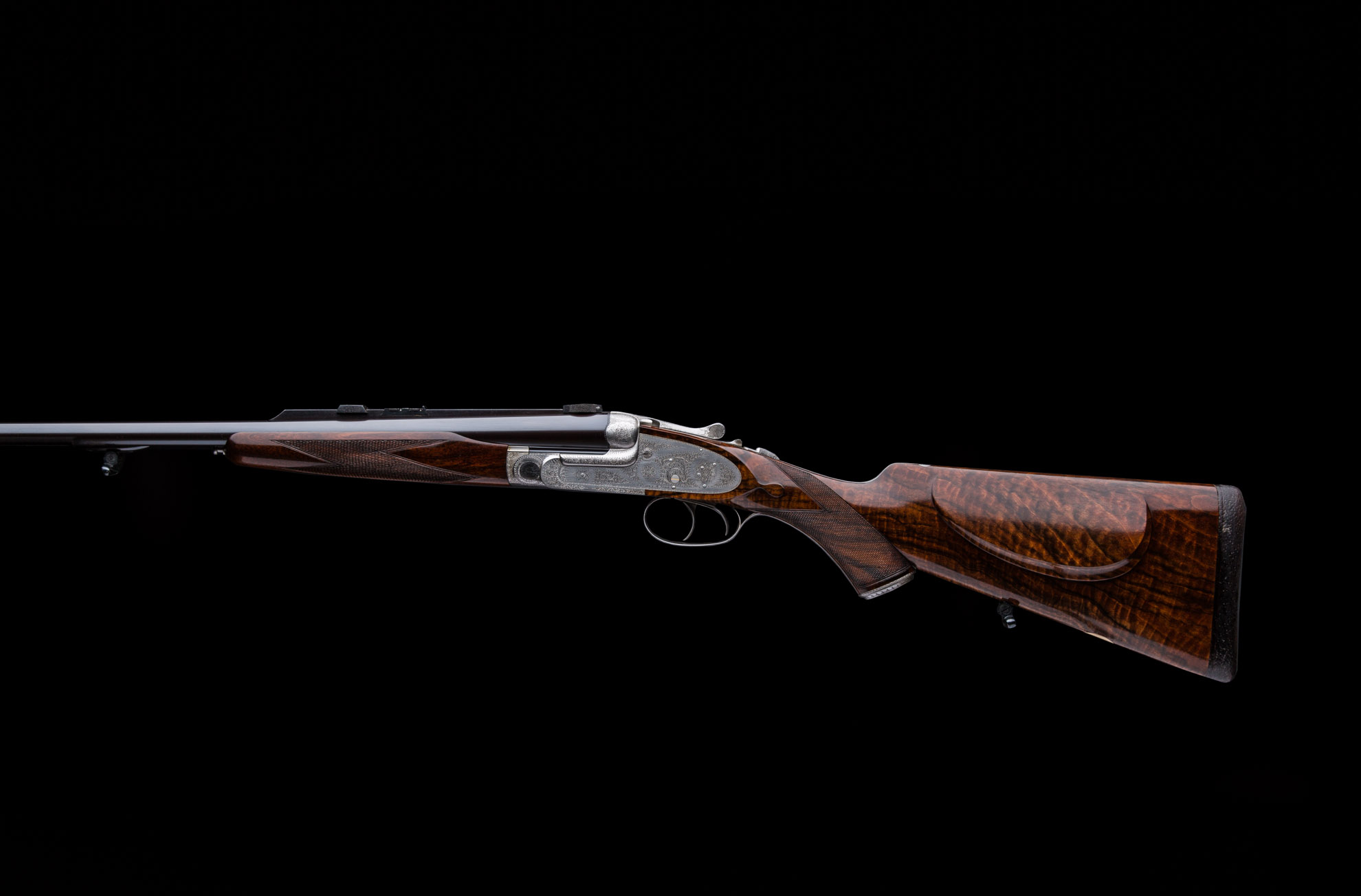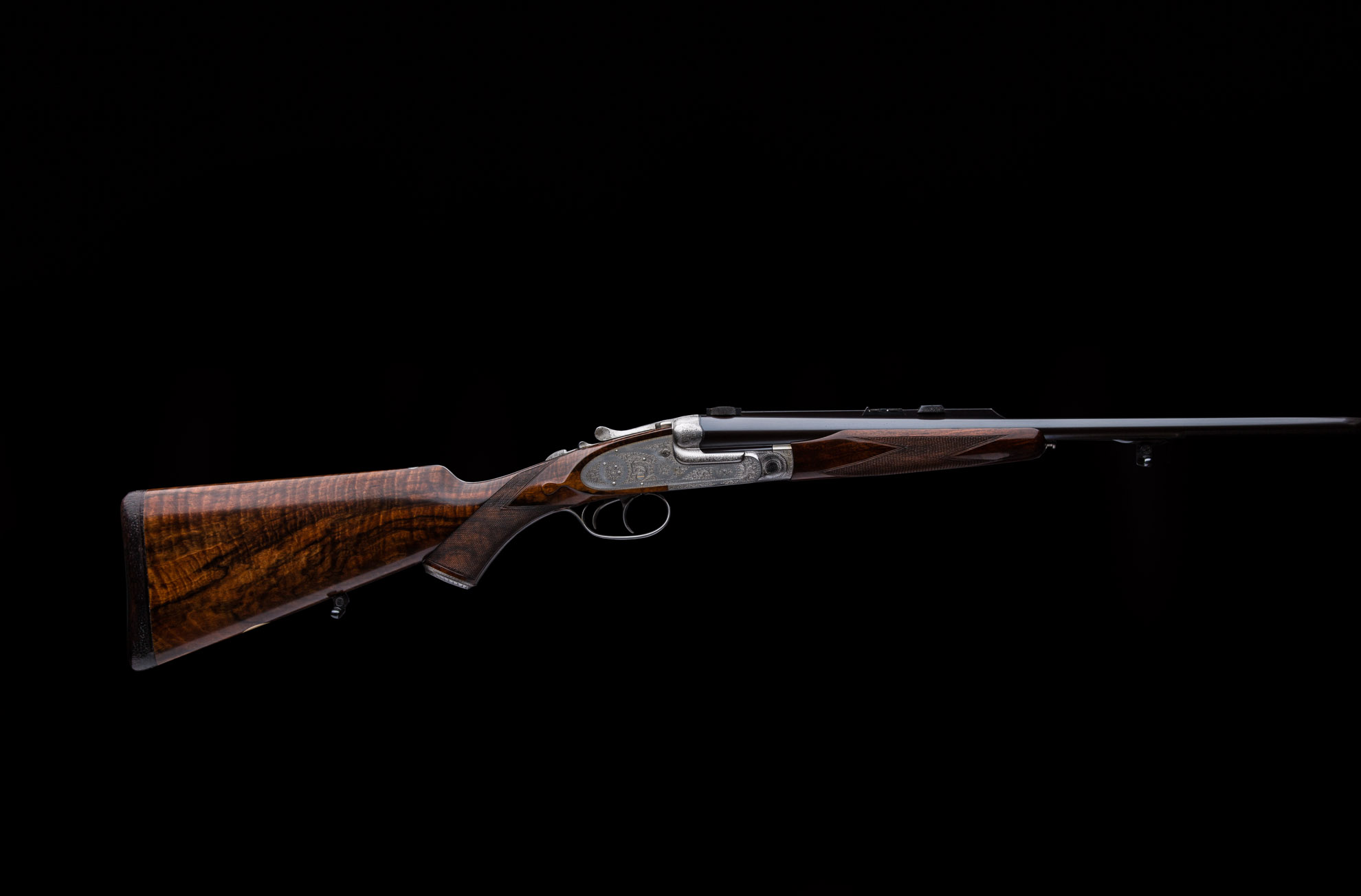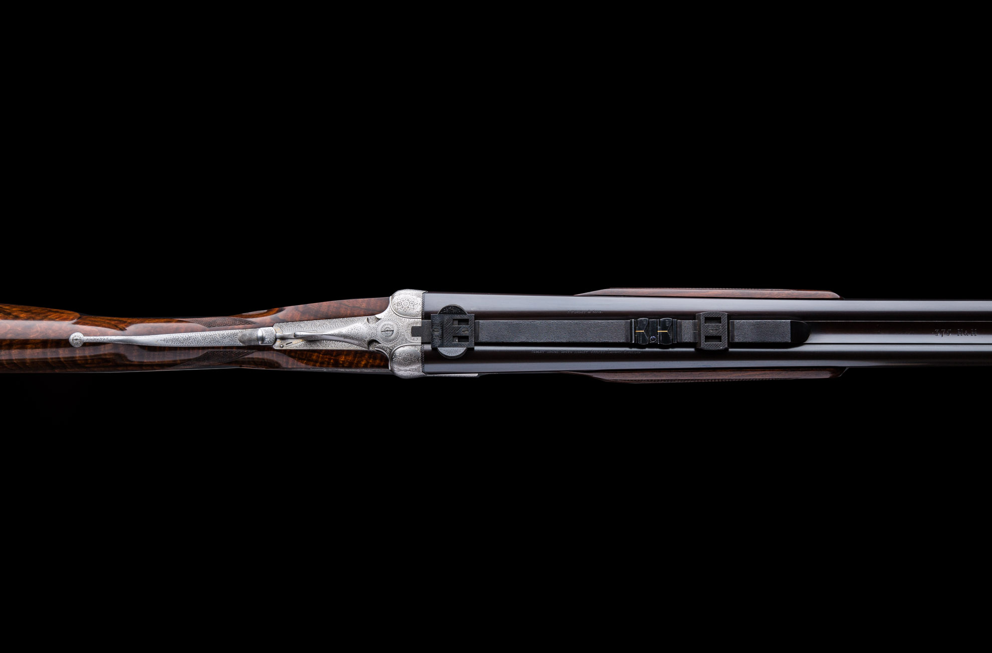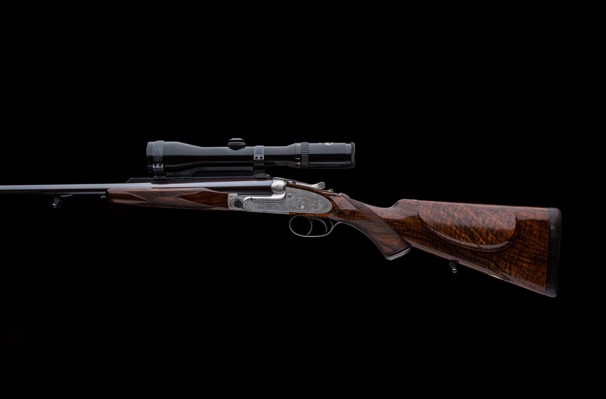 Chopper lump 23” bbls with rib extension third grip, quarter rib with two folding leaf rear sights and claw mounts along with Purdey’s distinctive “clam” shell front sight protector and flip up moon sight. The factory mounted S&B 1.5-6x42mm scope rest in a one-piece Purdey scope mount appropriately engraved and serial numbered to the rifle.