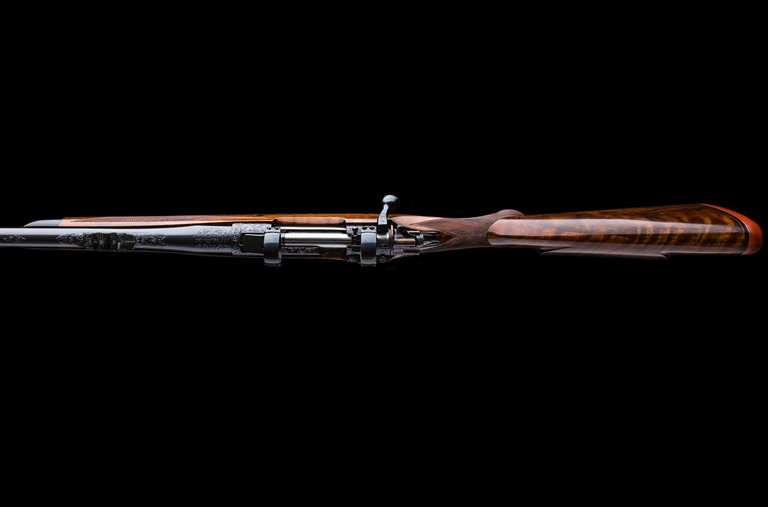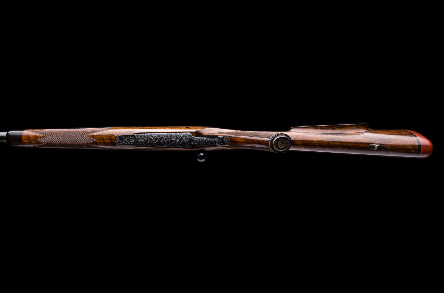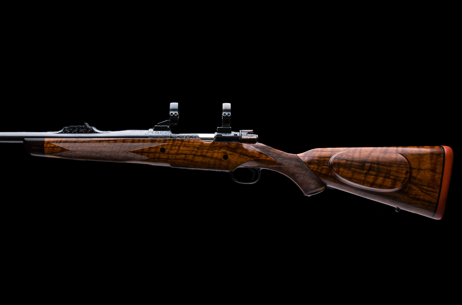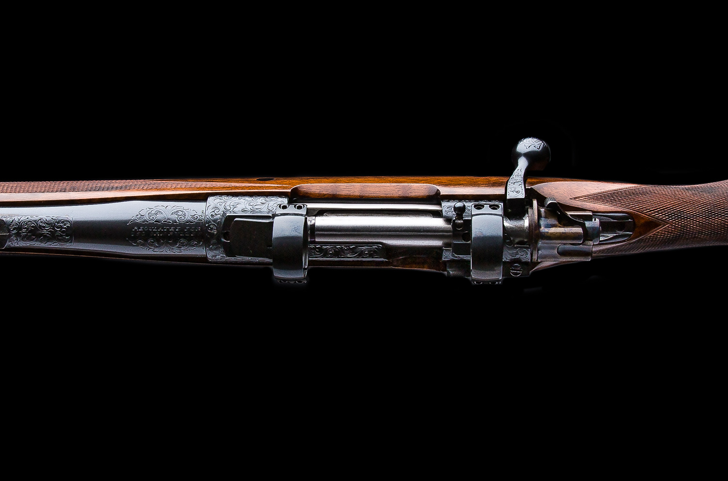 A Westley Richards & Co. Best Quality bolt action magazine rifle built in the late 1980’s. Chambered in .338 Win. Mag. the rifle is based on a prewar military Mauser action with a case colored bolt shroud and a 2-position Model 70 type safety. The 25” barrel has an island rear sight that has with 1 standing/2 folding Express sights (50, 100, 150 yds). Action is fitted with EAW swing mounts 30mm rings. Stocked in nicely figured walnut with a right hand English style cheekpiece, a point checkering pattern, horn forend tip, two recoil bar cross bolts capped with ebony and a traditional red pad. Full coverage Scroll engraving on the bolt handle, bottom metal, receiver, barrel shank, rear and front sight as well as the trap grip cap.  Overall, this gun is excellent inside and out.