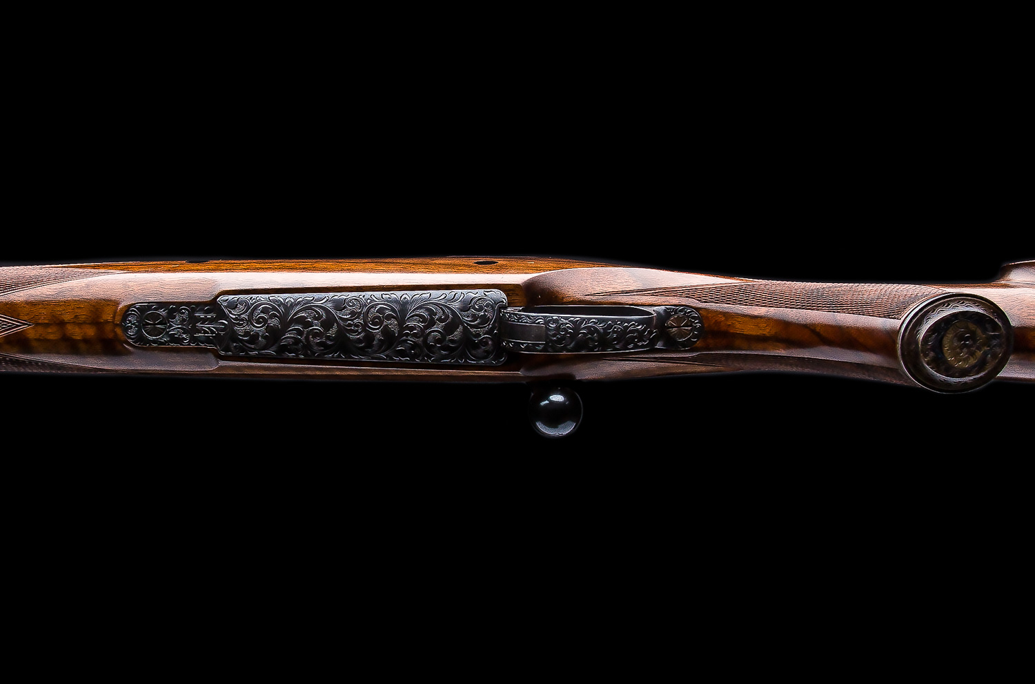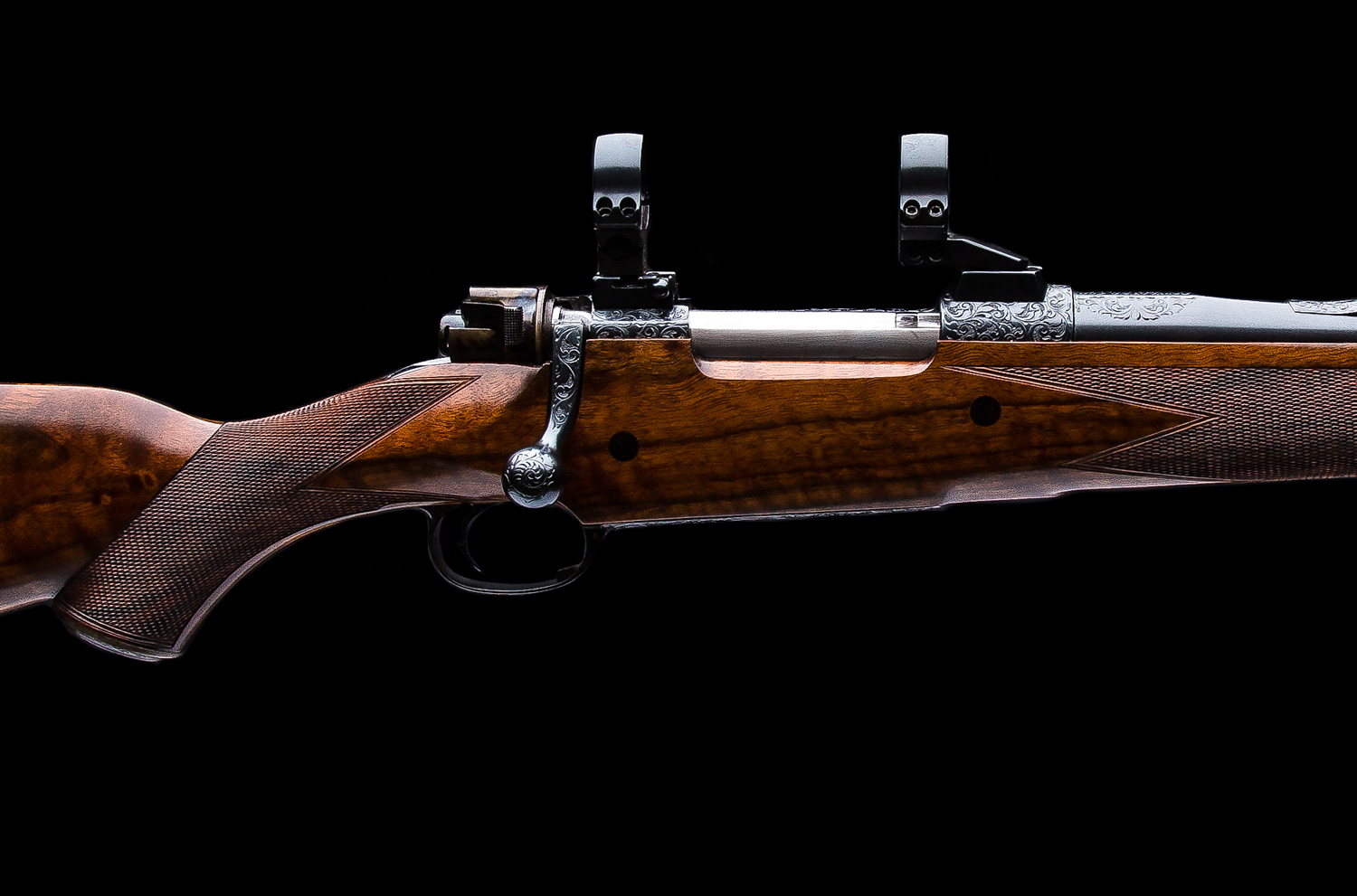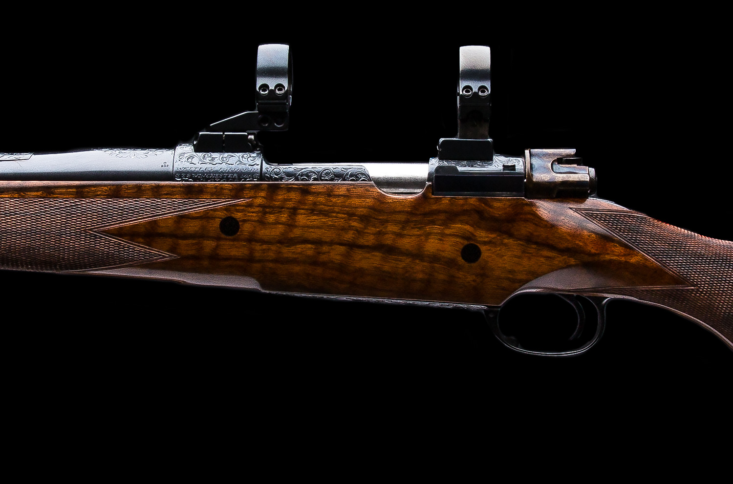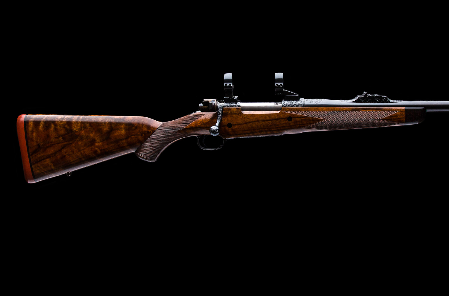 A Westley Richards & Co. Best Quality bolt action magazine rifle built in the late 1980’s. Chambered in .338 Win. Mag. the rifle is based on a prewar military Mauser action with a case colored bolt shroud and a 2-position Model 70 type safety. The 25” barrel has an island rear sight that has with 1 standing/2 folding Express sights (50, 100, 150 yds). Action is fitted with EAW swing mounts 30mm rings. Stocked in nicely figured walnut with a right hand English style cheekpiece, a point checkering pattern, horn forend tip, two recoil bar cross bolts capped with ebony and a traditional red pad. Full coverage Scroll engraving on the bolt handle, bottom metal, receiver, barrel shank, rear and front sight as well as the trap grip cap.  Overall, this gun is excellent inside and out.