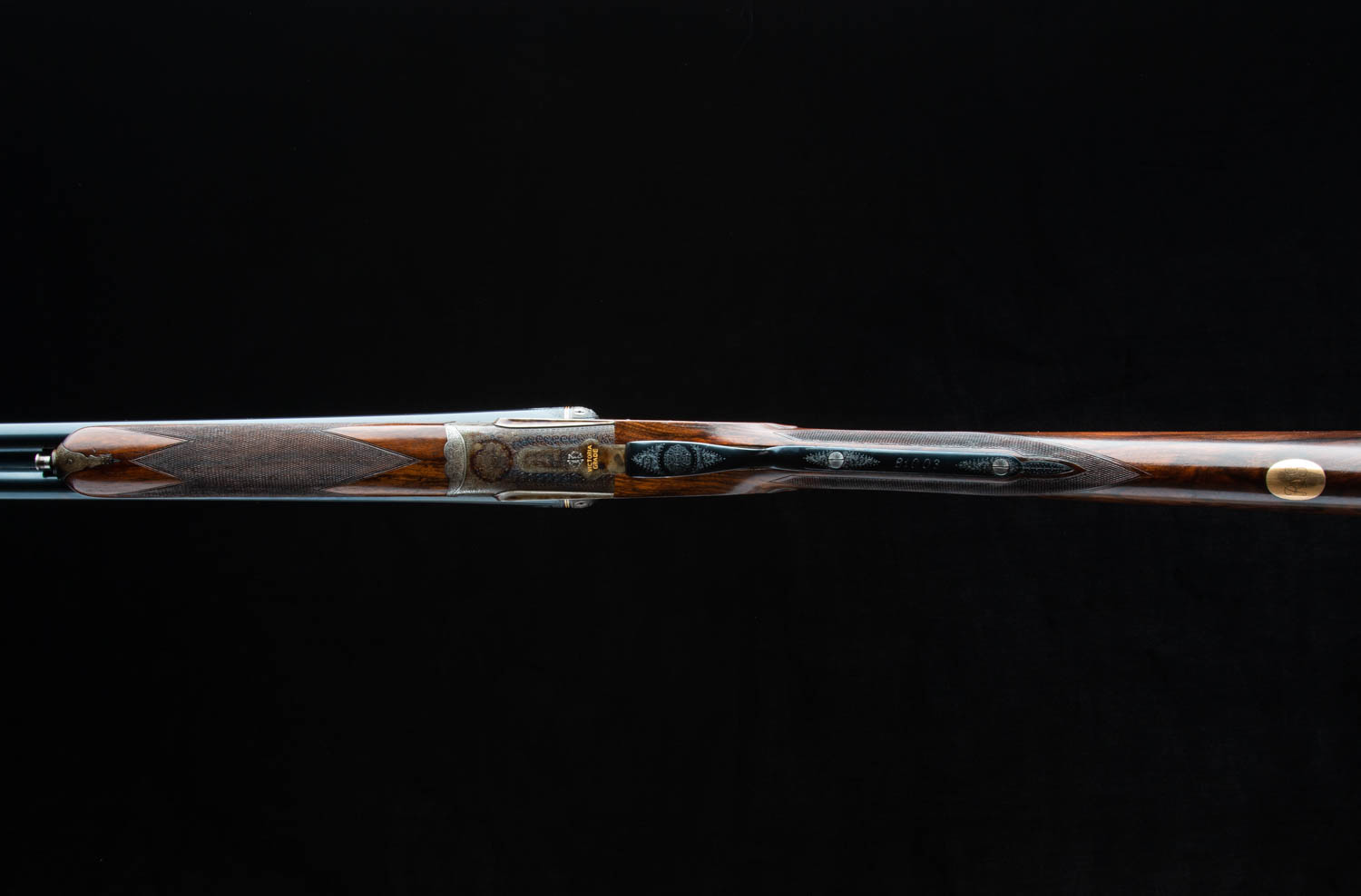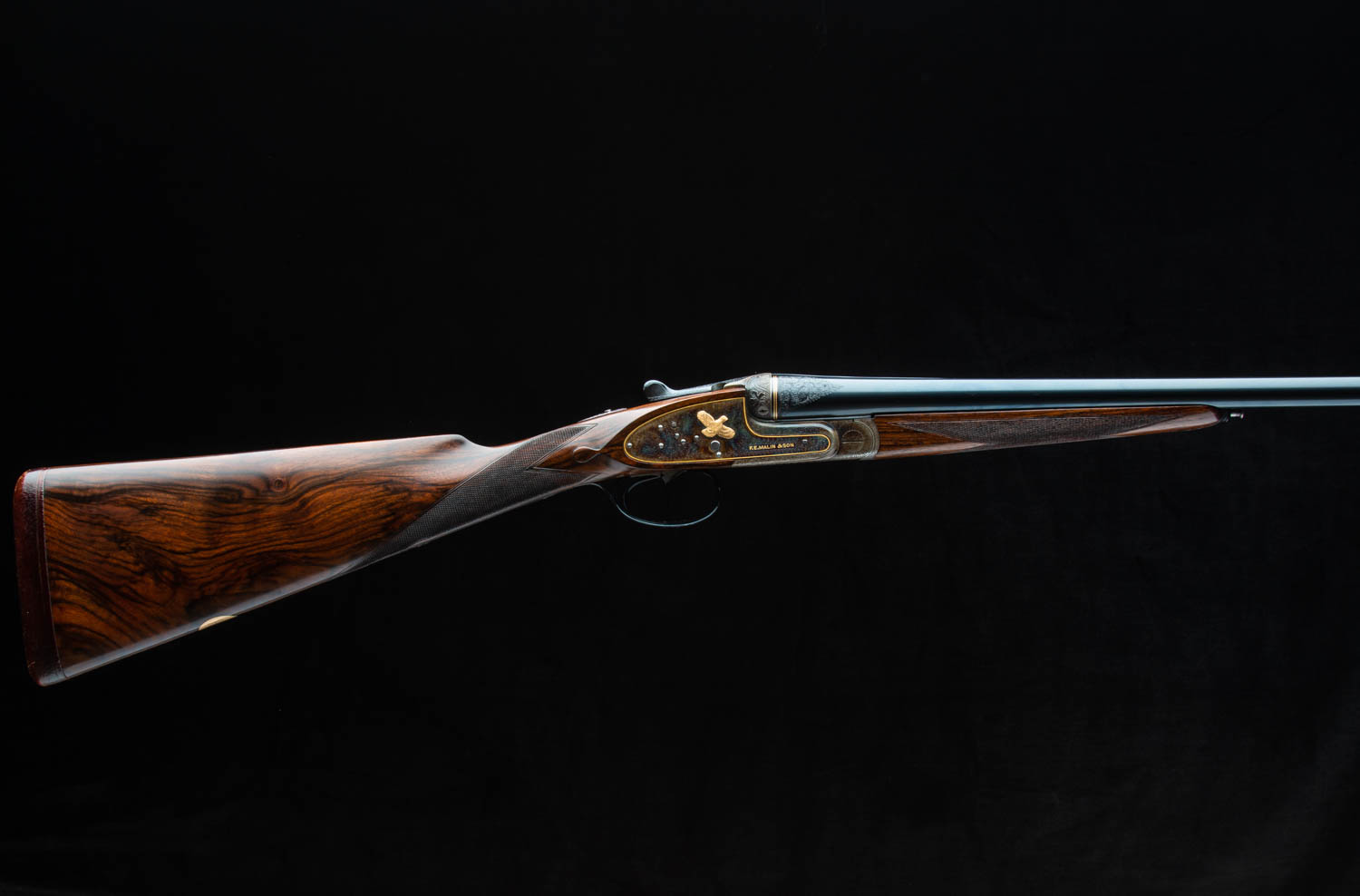 Sideplates and action body are engraved in traditional small scroll with a gold inlaid flushing woodcock on the left lock and a flying quail on the right lock. Fences are carved with maple leaves (canadian maker). The bottom of the action has "Victoria Grade" inlaid in gold as is the word "SAFE" in the appropriate place.