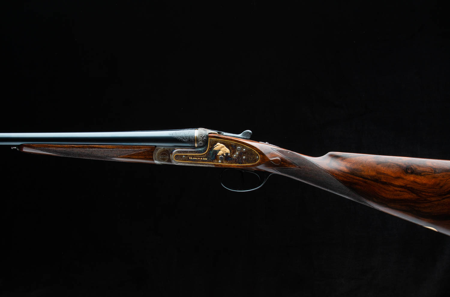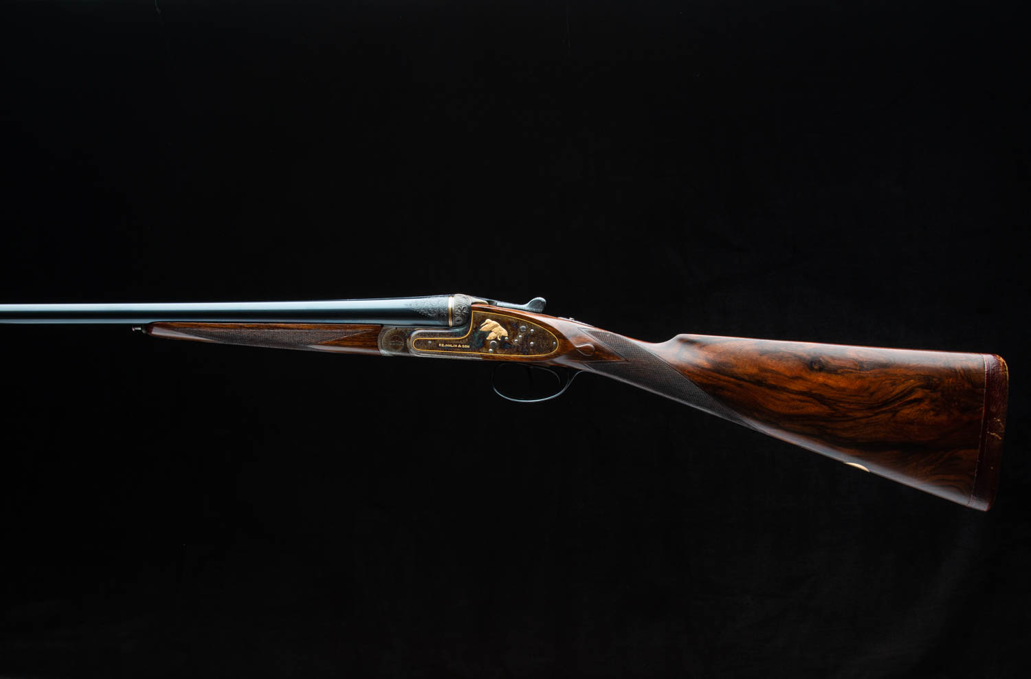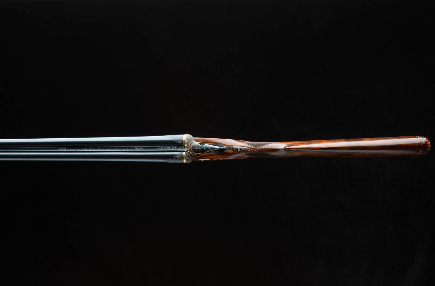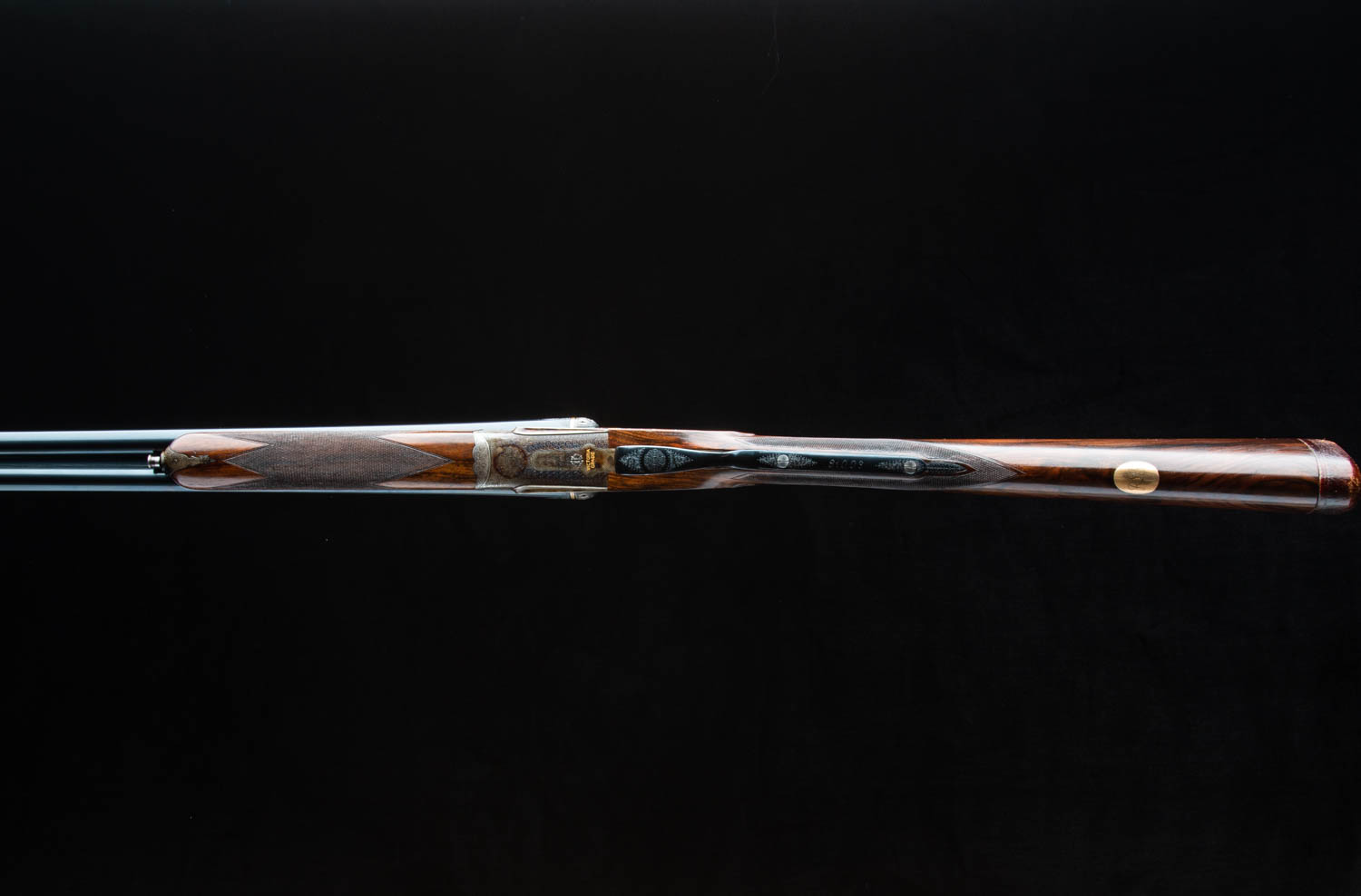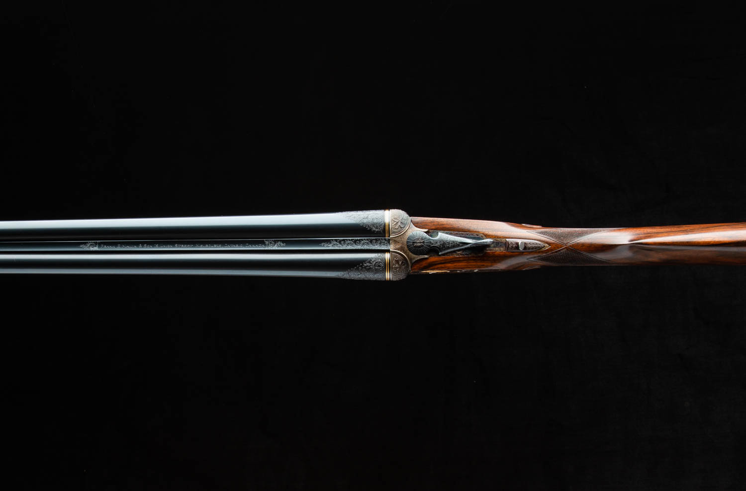 Bar action sidelock with nicely filed square bar, two triggers (front one hinged), automatic safety, hidden third-bite, and disk set strikers.
