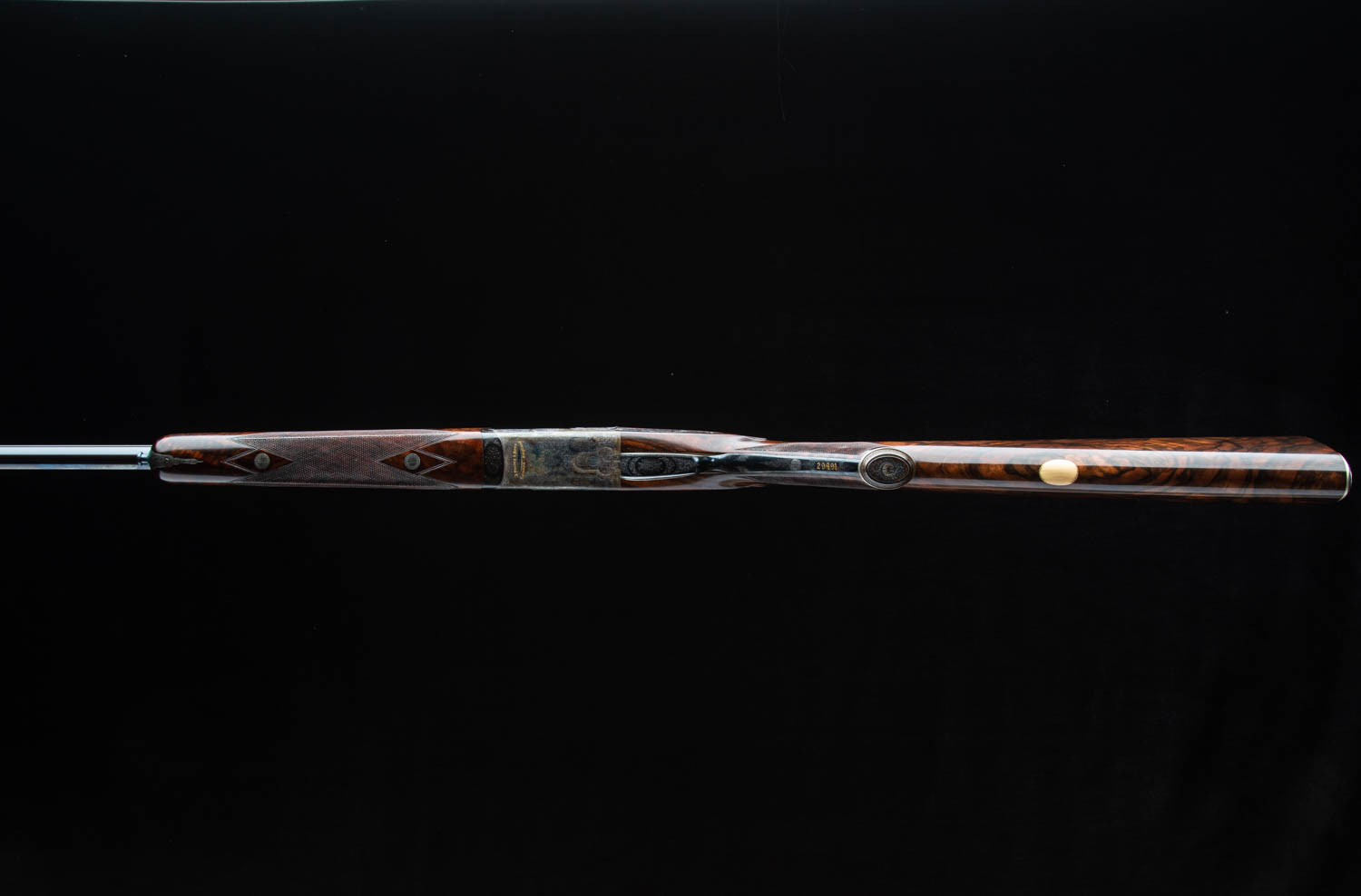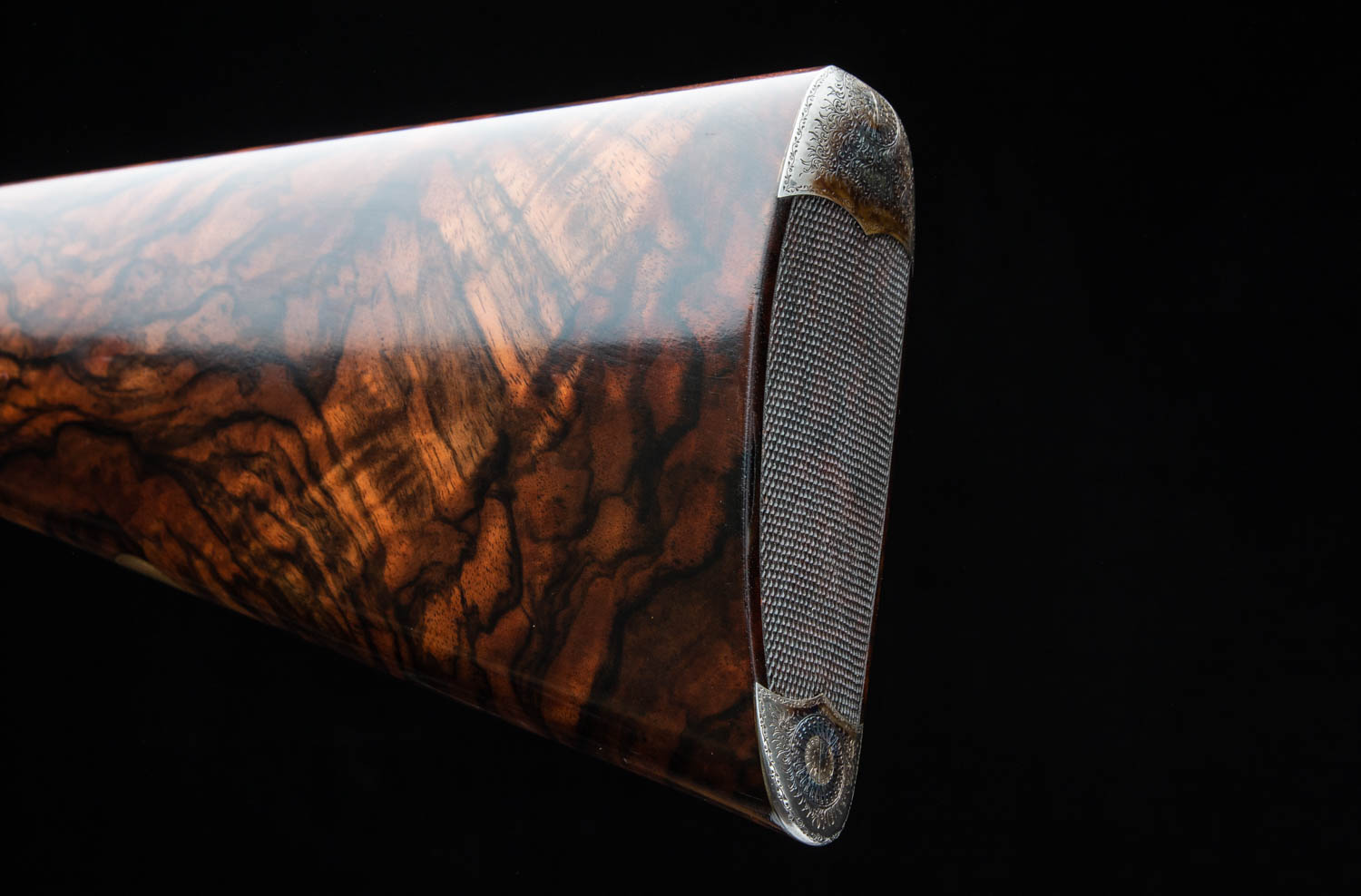 #29491 completed in 1997 is on a petite scaled action body with thinly filed action bolsters is color hardened and features House Rose & Scroll engraving wonderfully cut and signed by A.L. Hunt with the serial number, the word “SAFE”, and the Maker’s name inlayed in gold in old English script. The breech balls, or detonation, are carved with oak leaves which is a classic Purdey touch. Gold lined and fire blued cocking indicators and engraved and fire trunnion screws. Auto safety and a single trigger swept for a right-hand shooter.