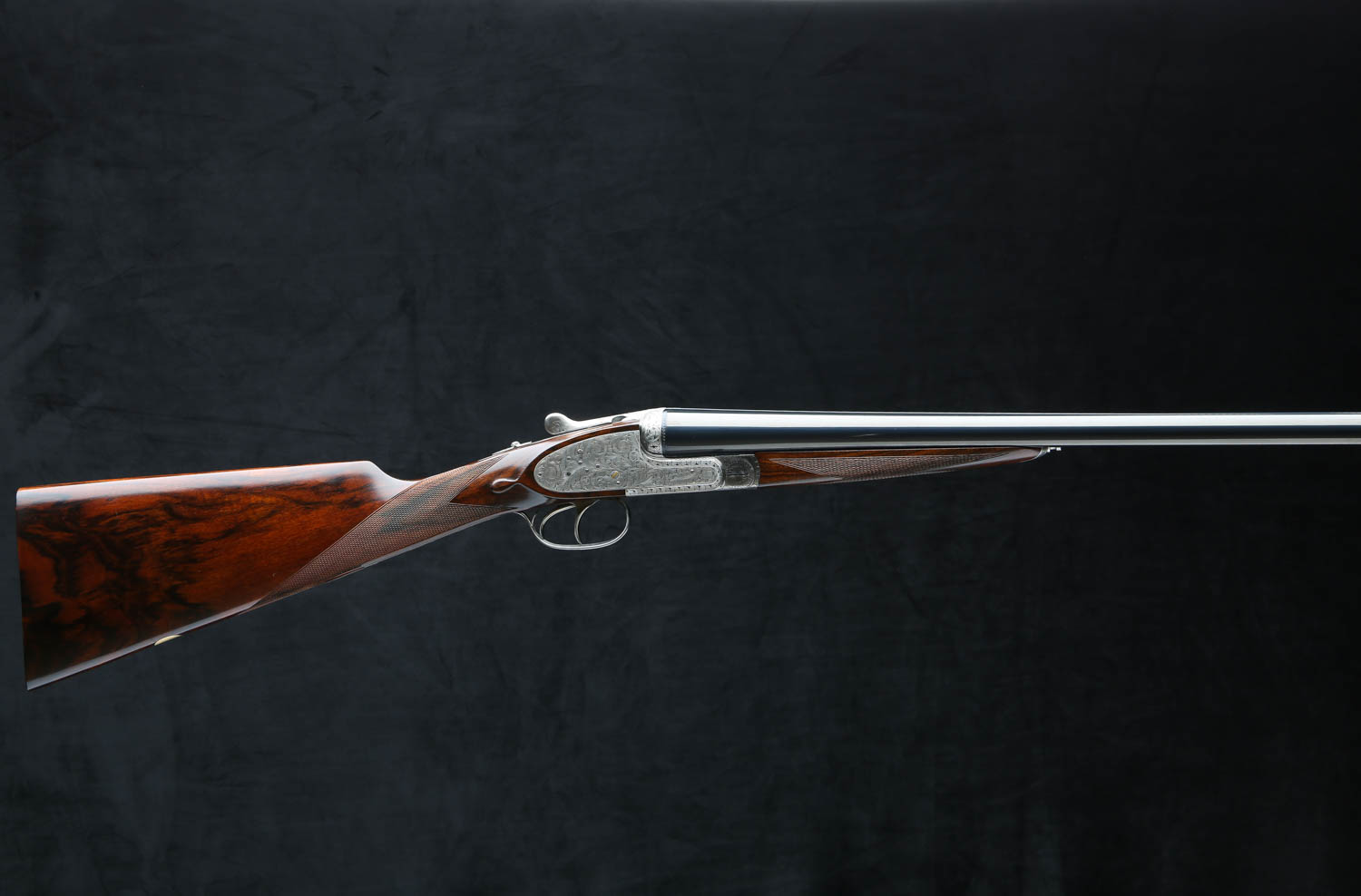 The nicely figured stock is stocked to the fences, has a straight grip with a "diamond" shaped hand, traditional drop points, and a checkered butt. The splinter forend is fitted with a push-rod release.