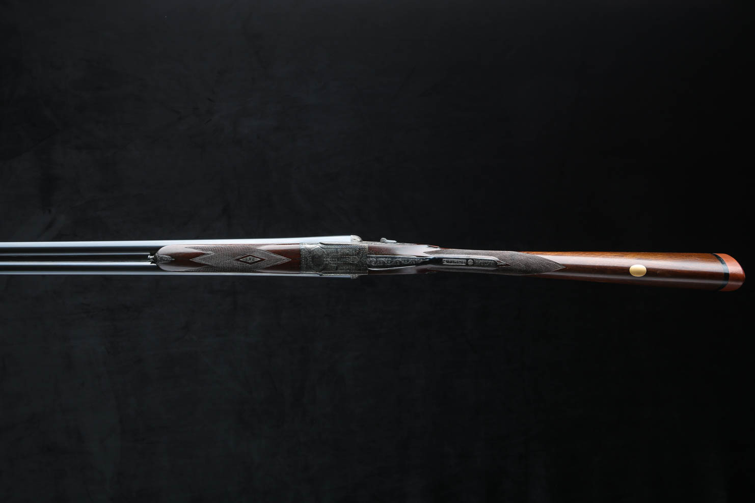 26” chopper lump barrels are fitted a smooth, concave game rib, 2 ¾" chokes, and Southgate type ejectors.