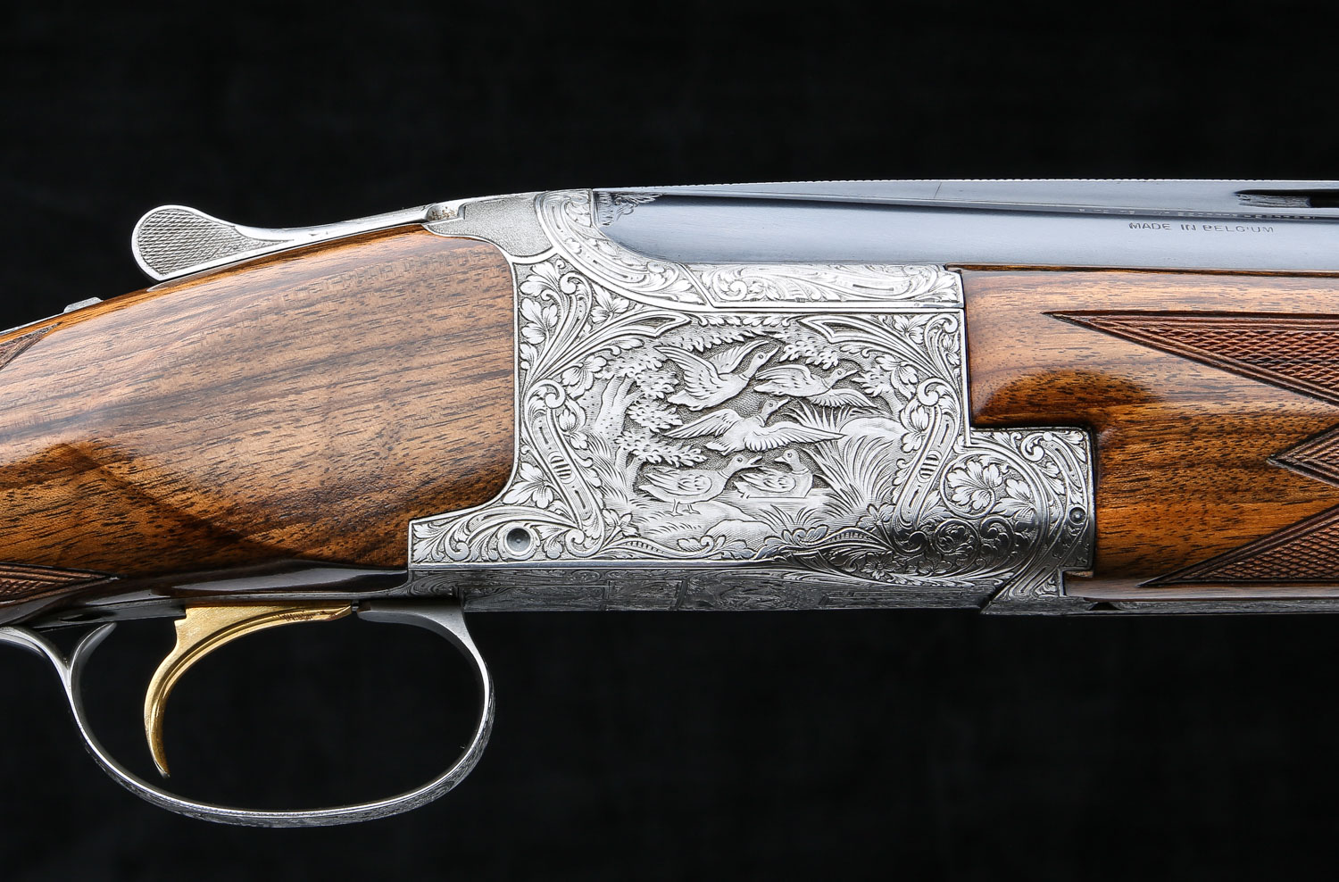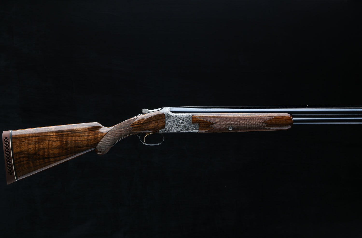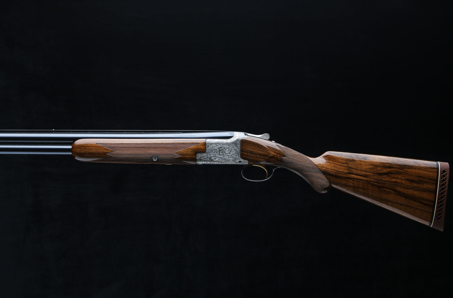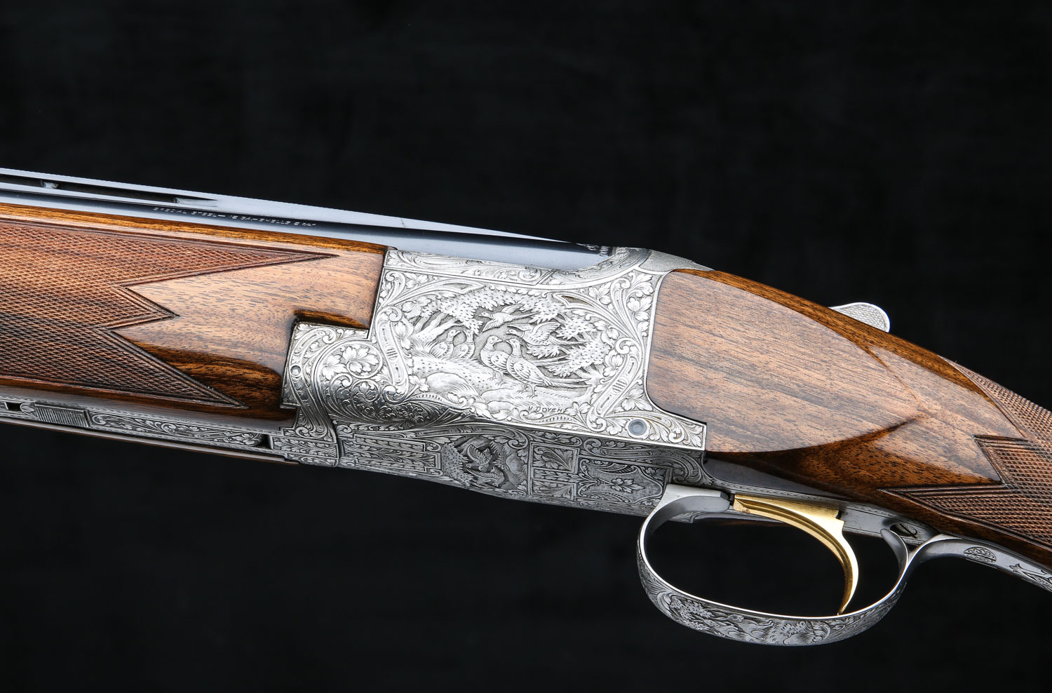 Both sets of barrels have lightning shaped forends and double white beads on the vent ribs. Butt stock has 14 ¼" LOP over Browning ventilated rubber pad.  Diana Grade game scenes are signed “V. Doyen”.