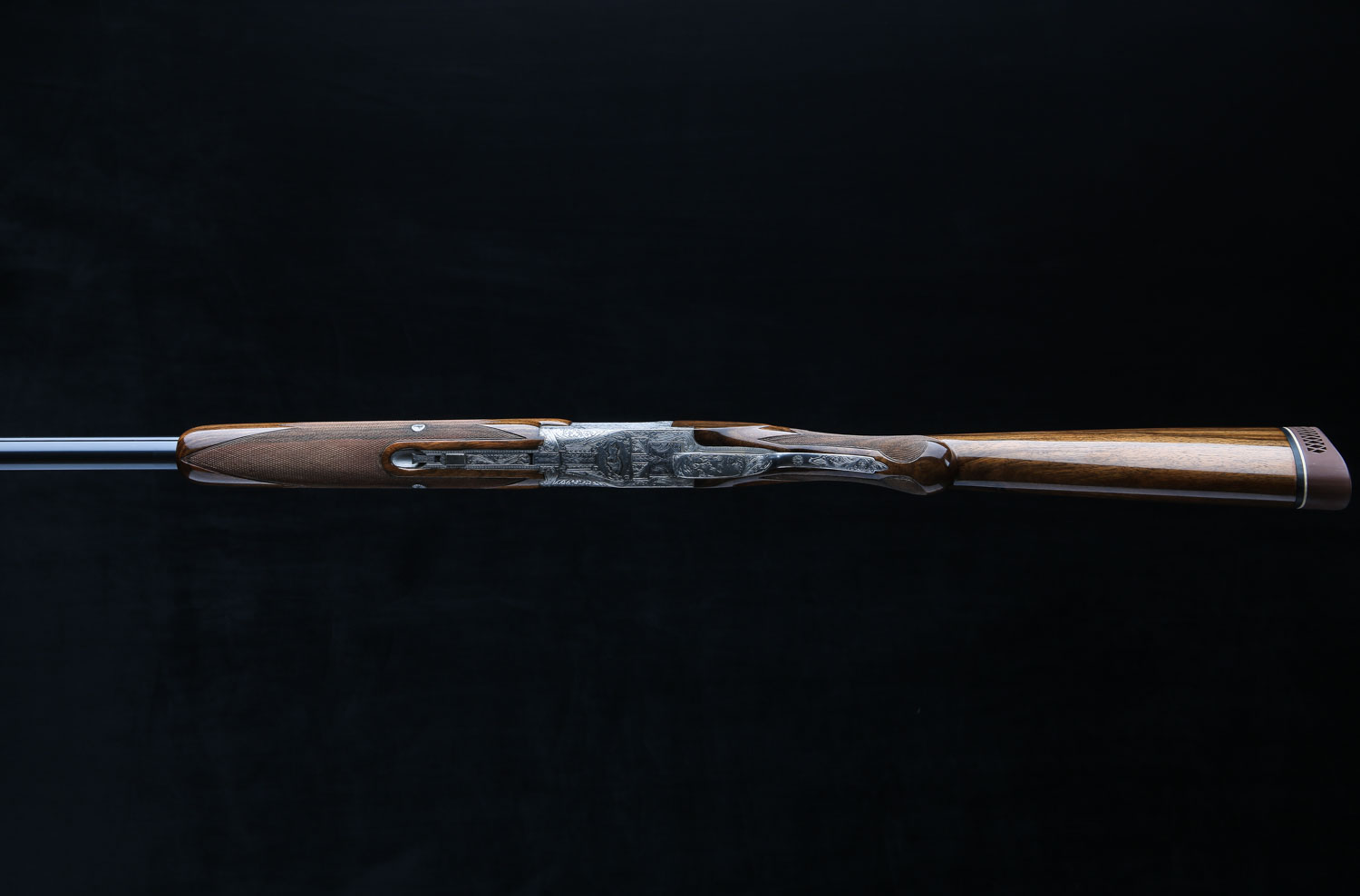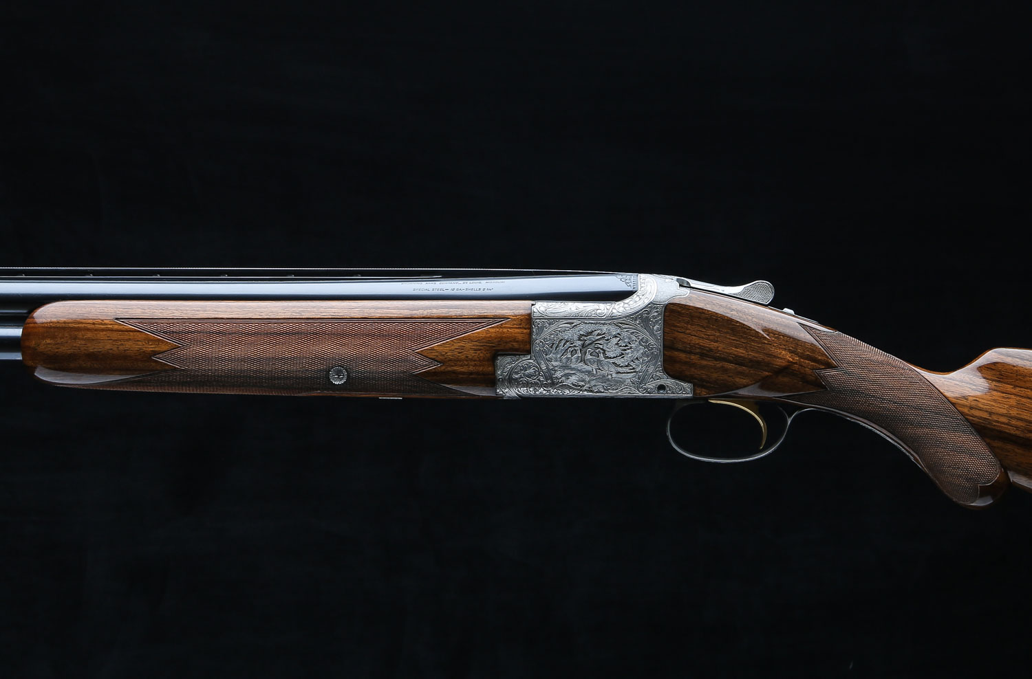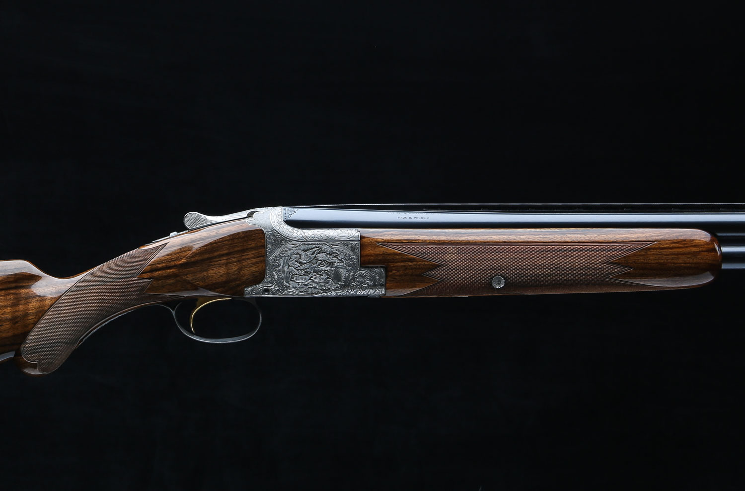 Both sets of barrels have lightning shaped forends and double white beads on the vent ribs. Butt stock has 14 ¼" LOP over Browning ventilated rubber pad.  Diana Grade game scenes are signed “V. Doyen”.