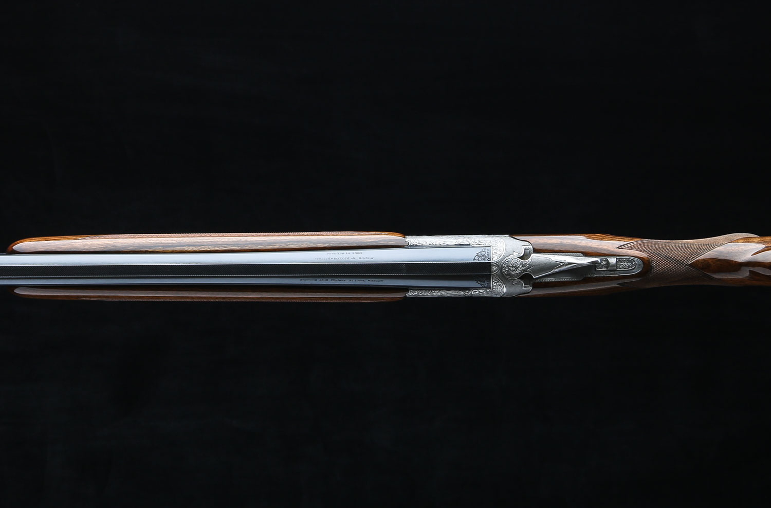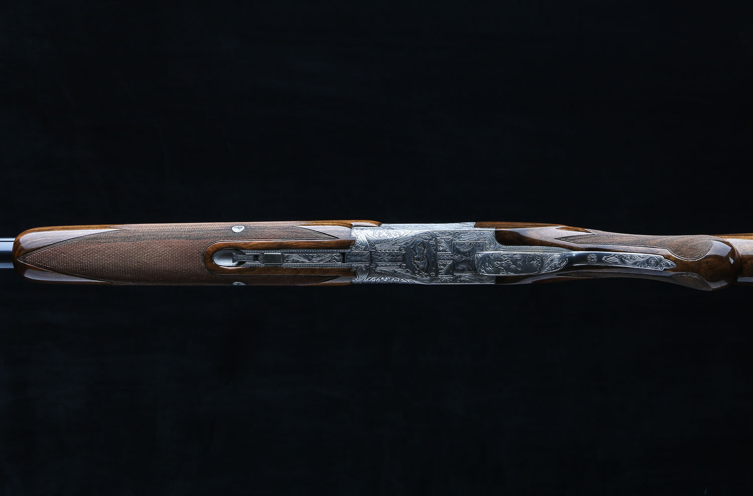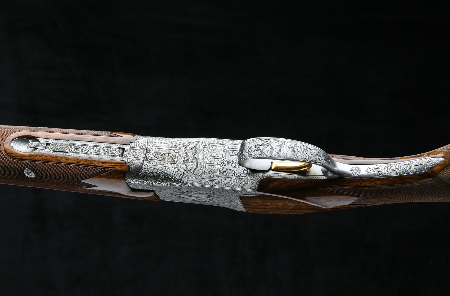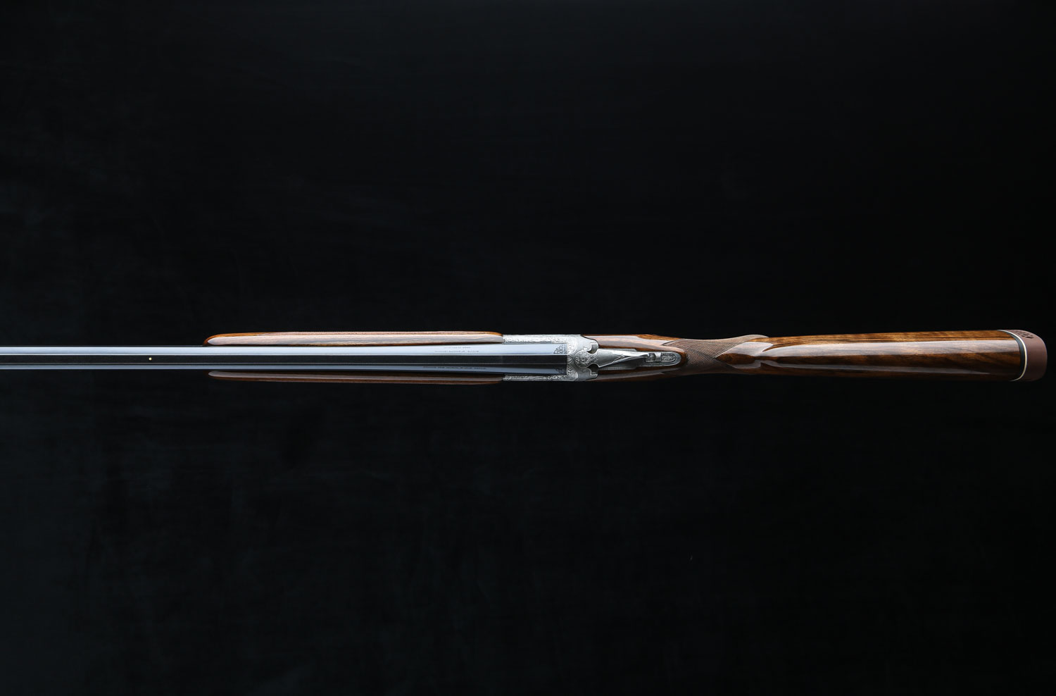 Both sets of barrels have lightning shaped forends and double white beads on the vent ribs. Butt stock has 14 ¼" LOP over Browning ventilated rubber pad.  Diana Grade game scenes are signed “V. Doyen”.