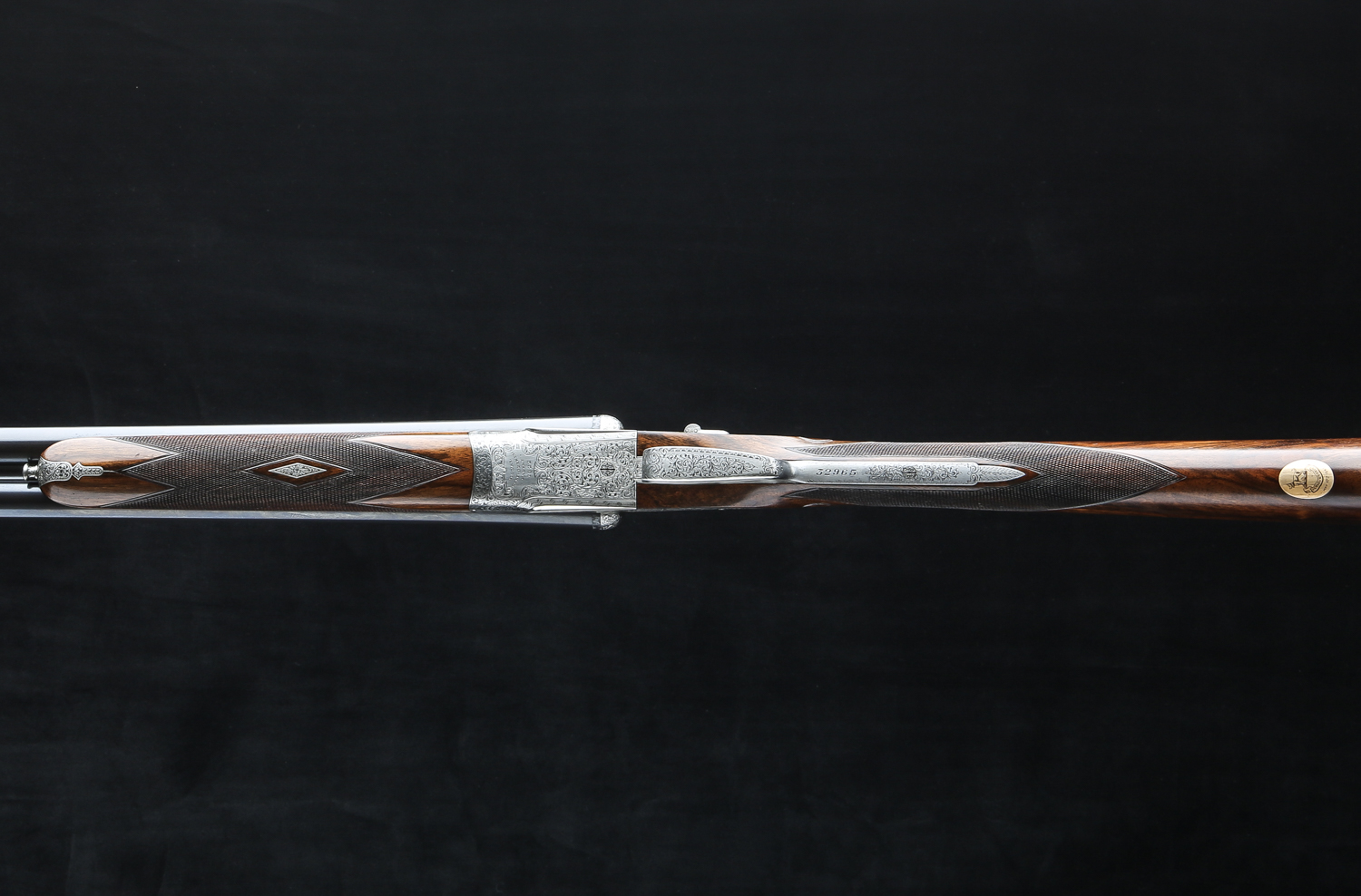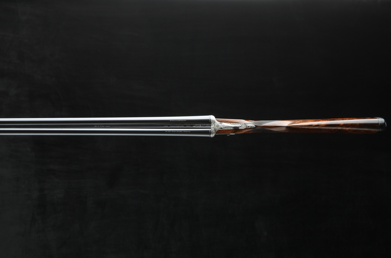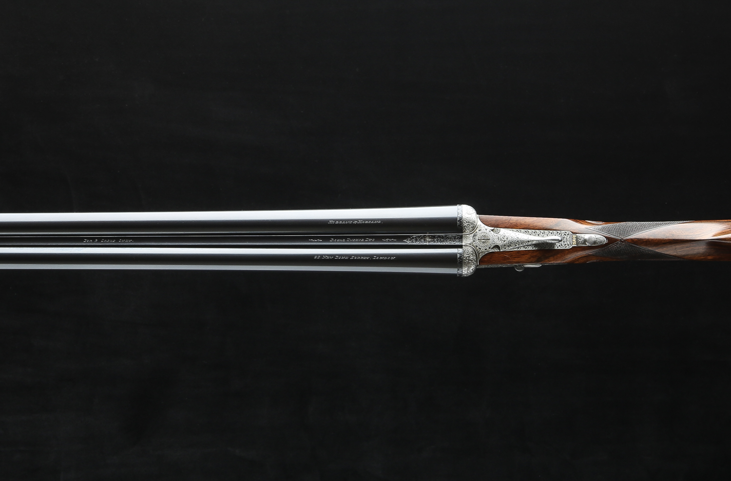 The Maker fitted new 27" chopper lump barrels to the gun in 2006 that are choked Cylinder in the right and .010" in the left. These barrels also fitted with a smooth, concave game rib and the Maker's patented self-opening mechanism. The Maker's name engraved on top of the right barrel and "Bruton St., London" engraved on top of the left barrel. Engraved on the rib is: "Royal Twelve Two".
