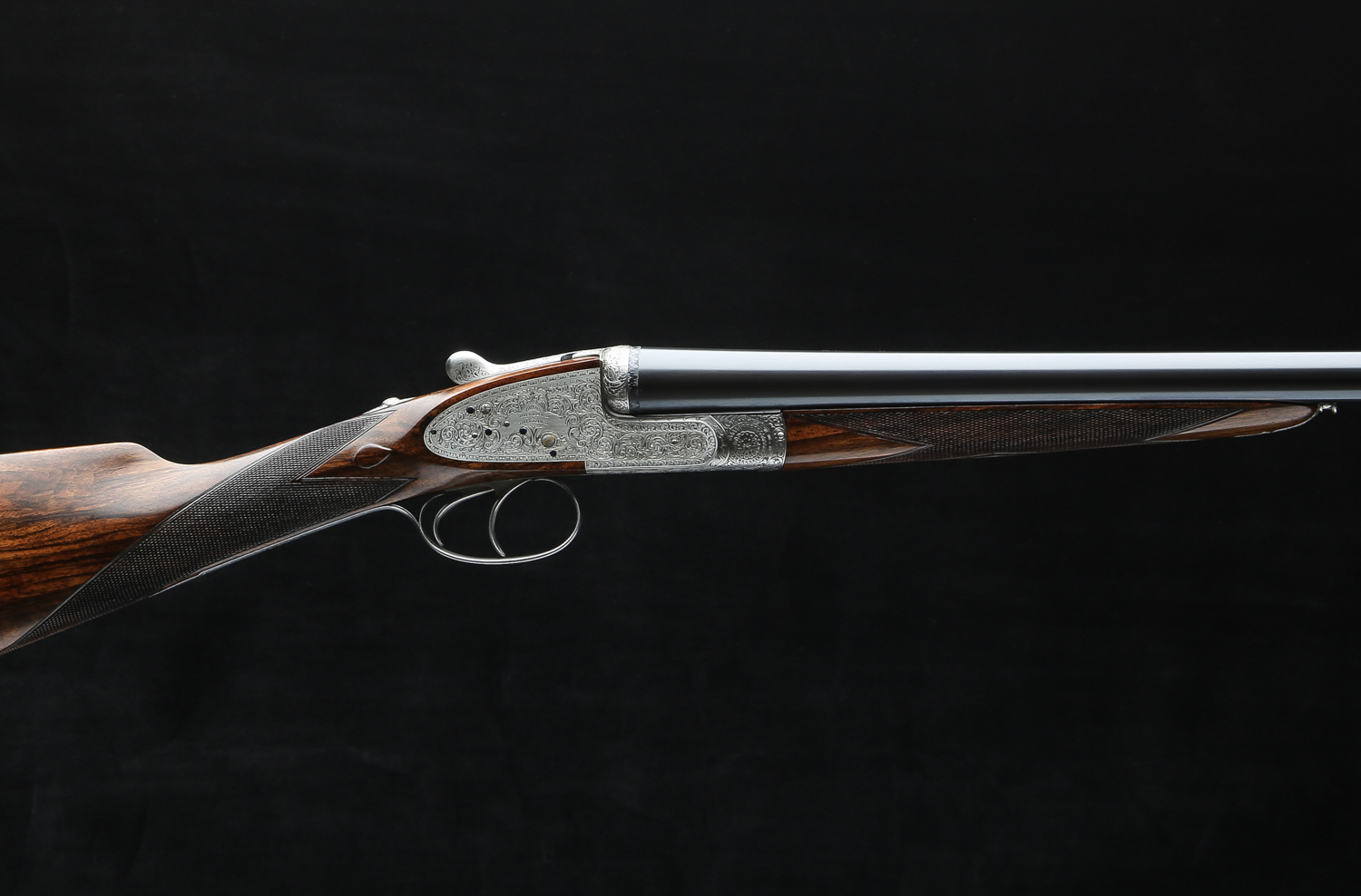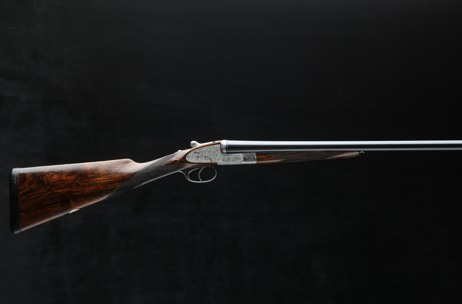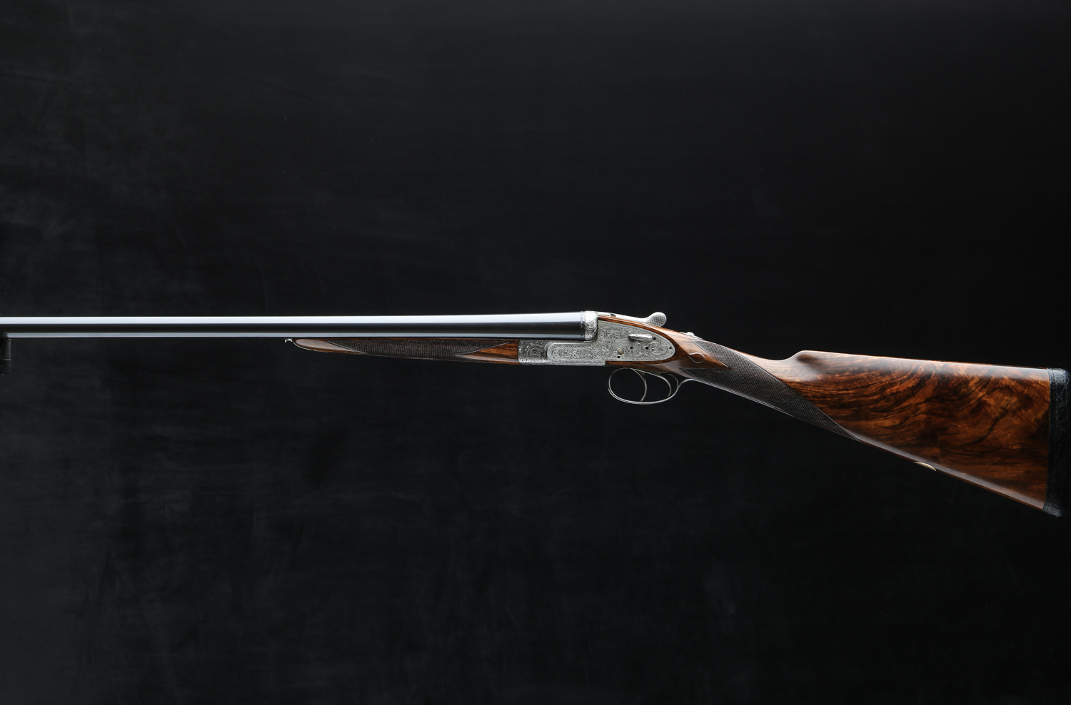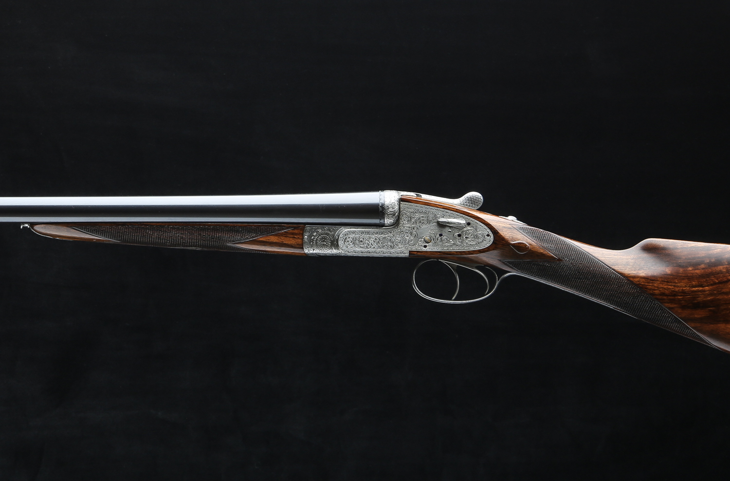The Maker fitted new 27" chopper lump barrels to the gun in 2006 that are choked Cylinder in the right and .010" in the left. These barrels also fitted with a smooth, concave game rib and the Maker's patented self-opening mechanism. The Maker's name engraved on top of the right barrel and "Bruton St., London" engraved on top of the left barrel. Engraved on the rib is: "Royal Twelve Two".