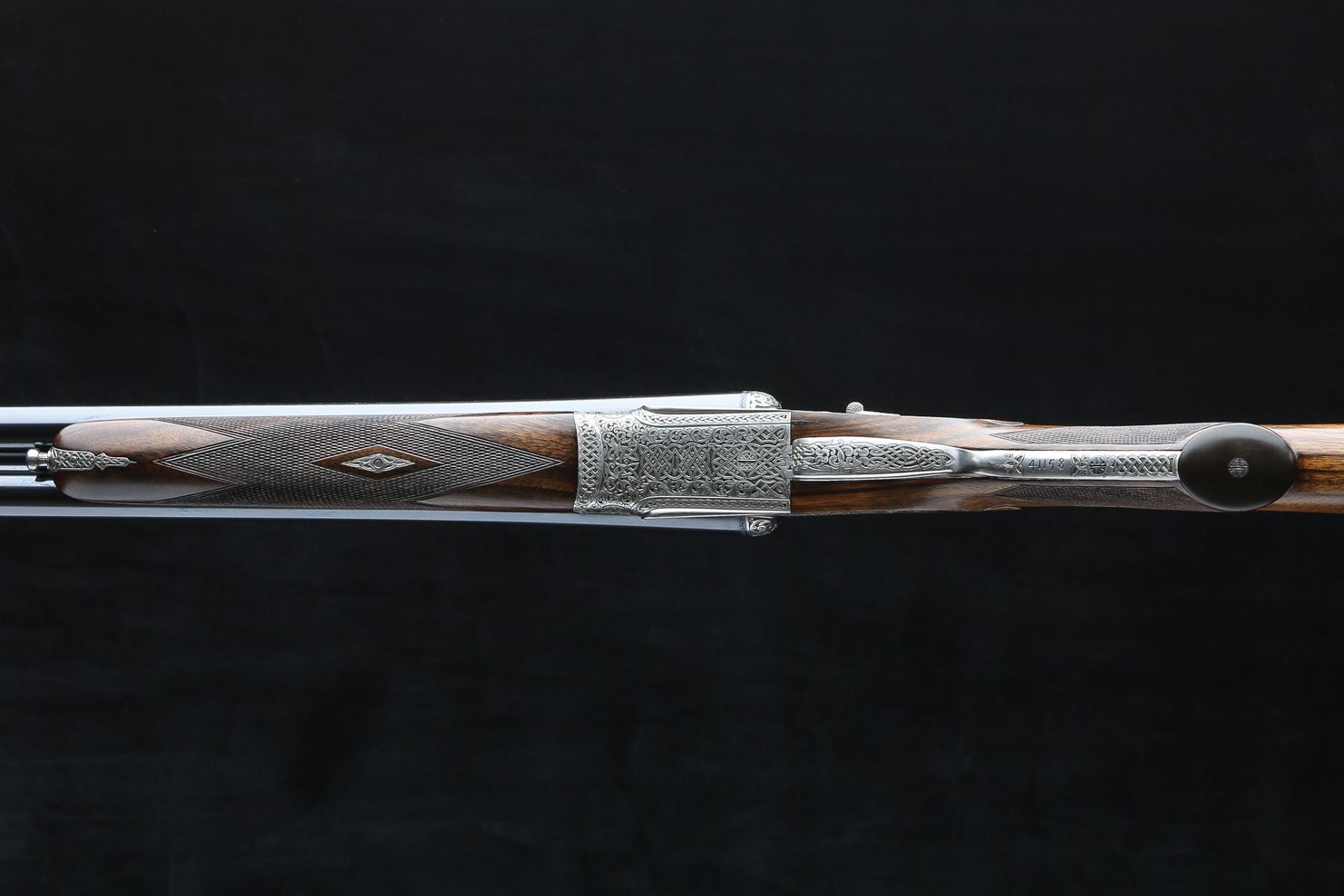 The 28" chopper lump barrels have Holland's self-opening mechanism hidden under the forend and Holland's patent ejectors. The Maker's name and "33 Bruton St" address are engraved on the top of the barrels and "Model de Luxe" is engraved on the top of the smooth concave game rib. The barrels have 1992 London proof marks and 2 3/4" (70mm) chambers.
