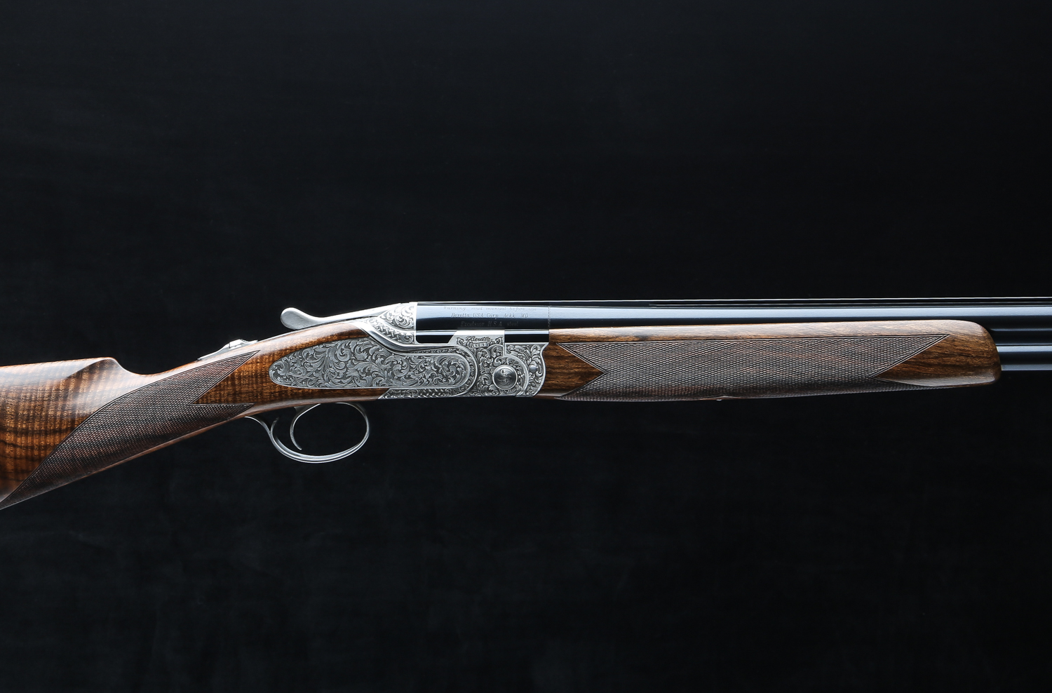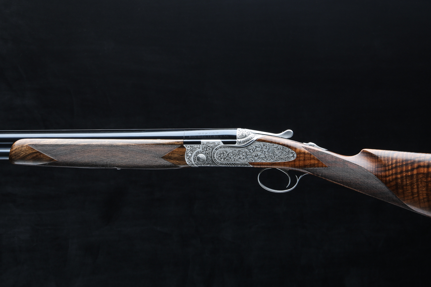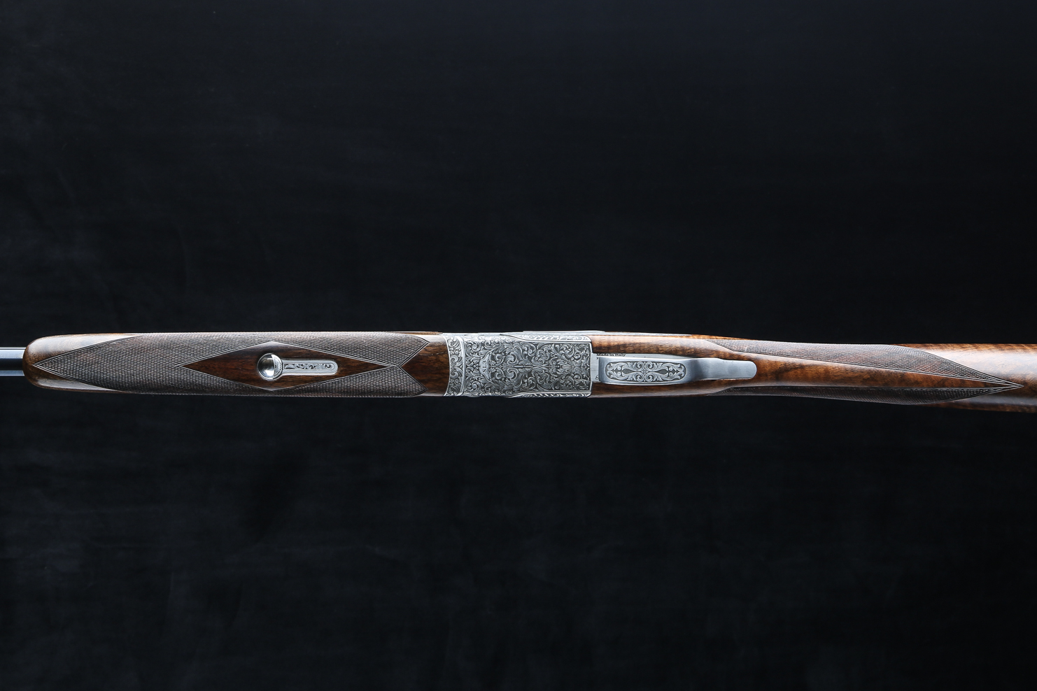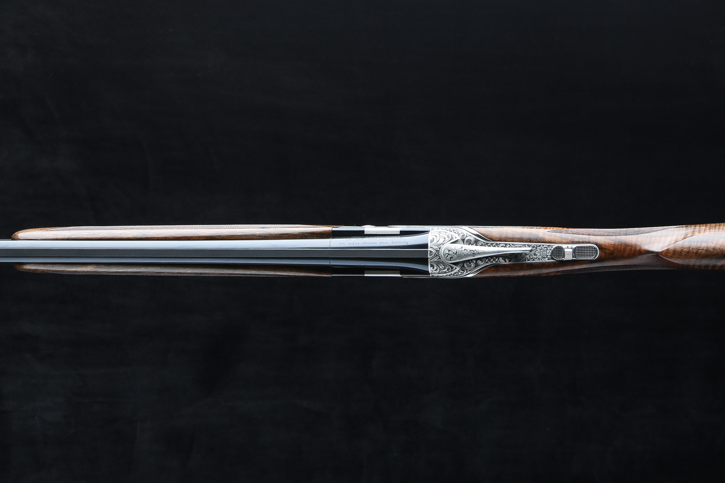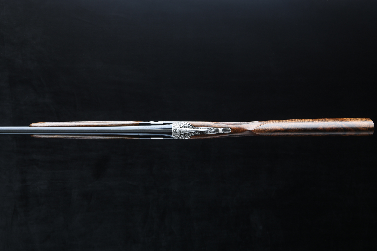 The sideplates and action body are engraved in a deep cut, deluxe bold scroll pattern which is laser cut. The engraving is signed by the creator of the engraving pattern. Nuovo Casello.