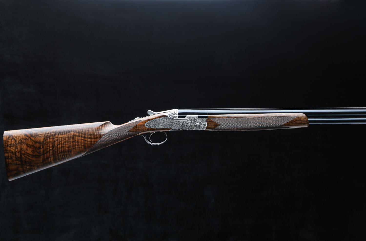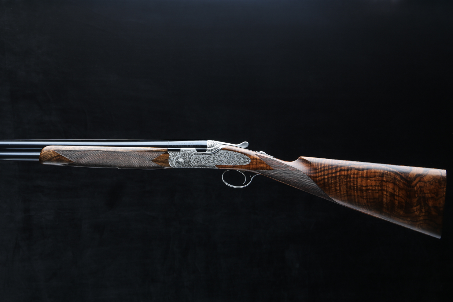 Beretta 20g SL3 Deep Scroll Over-and-Under Shotgun based on a new action design by Beretta of machine made parts that are hand fit and finished. This is a trigger-plate action with sideplates on in a dedicated 20g scaled frame. The action uses the same low profile design as the Boss & Co. and Woodward patents with bifurcated barrel lumps and hinge stubs, or trunnions, on the action walls. Beretta SL3 also has mid-breech locking pins and a pair of passive lower locking lugs as well as Beretta's signature interlocking shoulders on the barrels and receiver. Moreover, the main bolt locking shoulders, hinge-stubs and lower locking lugs are replaceable.