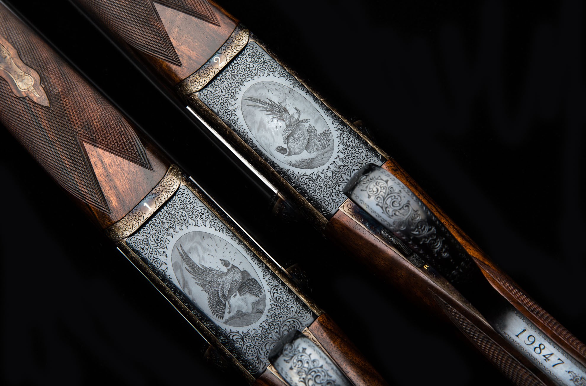 A new and unfired pair of Westley Richards Hand Detachable Lock 12g shotguns our patent snap lever work and Doll's Head rib extension, patent selective One Trigger, automatic safety and Westley's patent ejectors. The guns are case colored with house scroll engraving and Maker's name in banners on each side of the receiver and 2 superb game cameos by Vince Crowley of shot pheasants on the cover plates. Each gun's barrels, forend and top lever are appropriately numbered in gold "1" and "2".